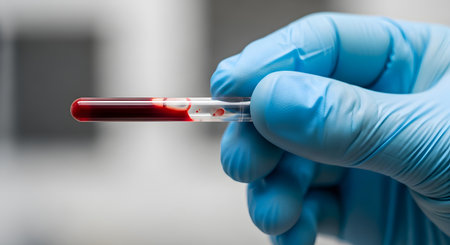 hand in blue gloves holding a blood test tube in front of a lab room