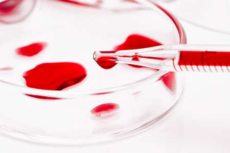 Bottom view. A researcher in the laboratory drips blood from a pipette into a Petri dish.
