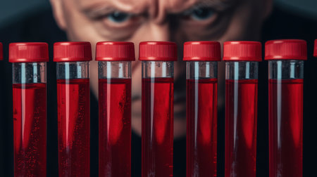 A focused scientist analyzes a row of test tubes filled with red liquid in a laboratory, emphasizing the importance of meticulous observation in scientific research.