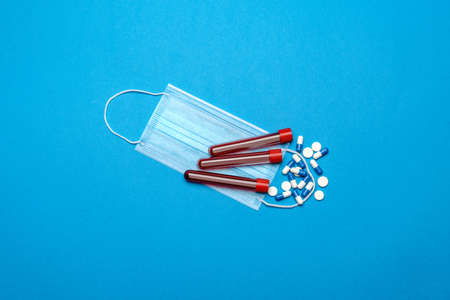 Protective medical face masks, test tube with blood sample and pills on a blue background - Top view with copy space