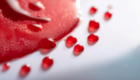 Close up image of blood drops on a white surface, symbolizing health, life, and medicine.