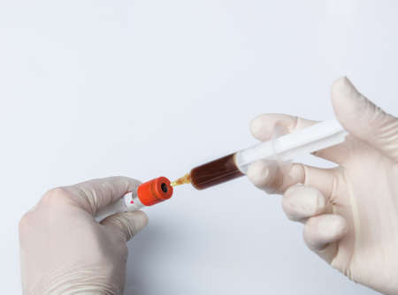 close up of hand in medical gloves handling a blood sample and a syringe
