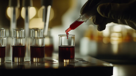 A scientist uses a pipette to add a drop of red liquid to a test tube in a modern lab. This image captures the essence of research and innovation in medical science and technology.