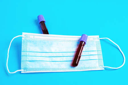 Protective face mask and test tubes with blood on a blue background.
