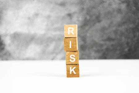 A stack of wooden blocks spells out the word RISK against a blurred gray backdrop, symbolizing uncertainty and potential challenges.