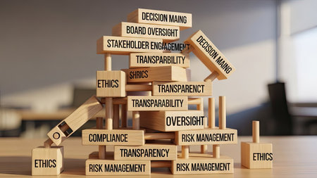 A collection of wooden blocks, each inscribed with business-related words such as ethics and risk management, are carefully stacked. The composition demonstrates concepts of structure and organization. Soft lighting and a shallow depth of field create a professional atmosphere. Suitable for illustrating business strategy and corporate governance in various visual contexts.