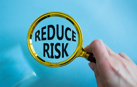 Reduce Risk symbol. Magnifying Glass with words Reduce Risk. Businessman hand. Beautiful blue background. Business and Reduce Risk concept. Copy space.