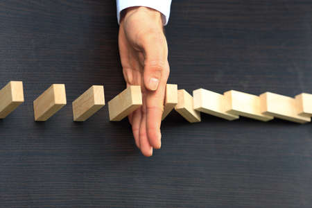 A professional businessman hand intervening to stop a row of falling wooden domino blocks on a desk to demonstrate successful risk management and crisis prevention strategy.