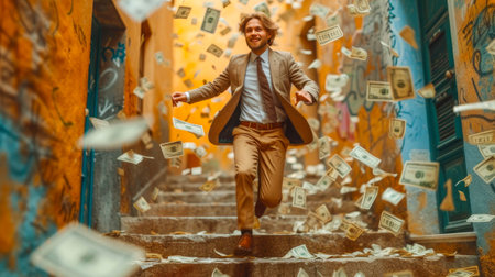Businessman running down the stairs in the rain of dollar notes.