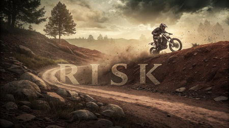 A Risk motocross rider navigates dirt track with word risk embedded in scene, highlighting thrill and challenge of sport