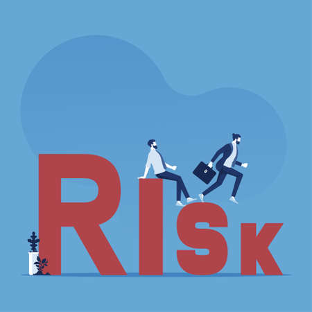 Miniature people group of businessmen stand on cube word with risk. Risk analysis for investment. The concept business risk assessment or management concept