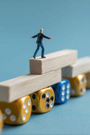 A small figure balances on wooden blocks above colorful dice, showing the concept of risk versus reward in decision-making in business.