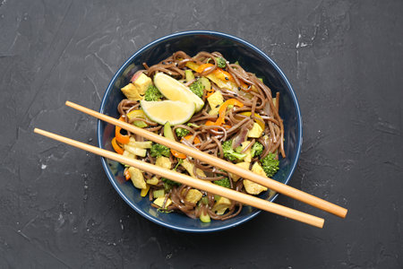 Soba noodles vegetable stir fry in bowl. Table top view, vertical compisition