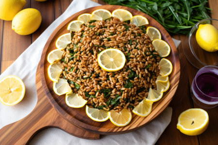 farro salad with sliced lemon on a circular wooden board, created with generative ai