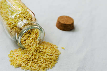 Raw Italian risoni pasta in a glass jar scattered on a table. The concept of traditional cuisine. horizontal orientation. copyspace.