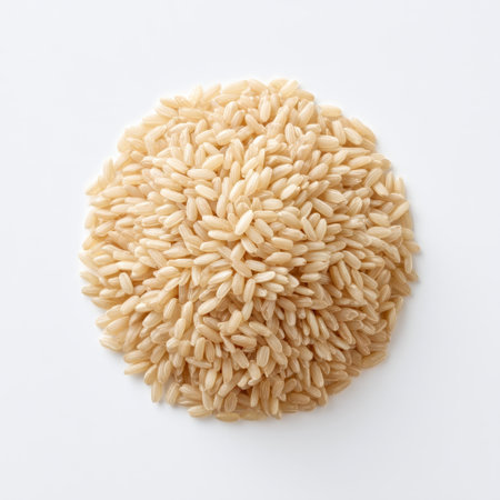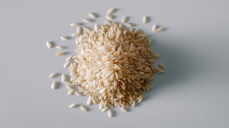 A closeup of a pile of uncooked rice grains on a smooth white surface. The image highlights the texture and natural colors, perfect for culinary and food-related projects.