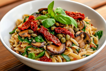 A vibrant pasta dish features spirals combined with sauted mushrooms, sun-dried tomatoes, capers, and fresh basil. The colorful ingredients create an appetizing look on the table.