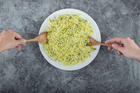 Female hand taking rice from white plate
