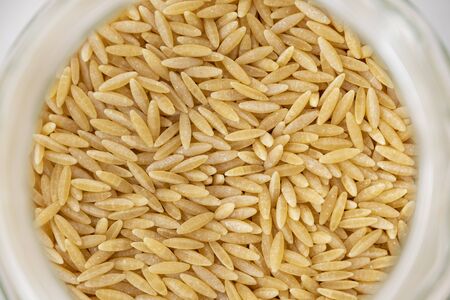 Dry risoni pasta in a glass jar on a light background. top view.