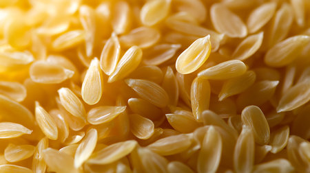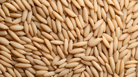 A detailed overhead view displays a dense pattern of uncooked rice grains. The texture and uniformity suggest wholesome food and agricultural abundance.