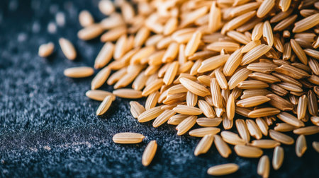 Top view of a heap of rice seeds on a table, creating a textured pattern with grains scattered around, ideal for food backgrounds or organic design.