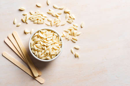 Natural depilatory film wax bean granules and wooden spatulas, copy space. Hair removal, natural beauty concept, white pearl wax.