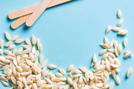 Natural depilatory film wax bean granules and wooden spatula on blue background close up. Hair removal, natural beauty concept, pearl wax.