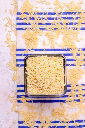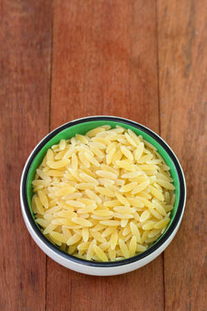 Raw uncooked orzo pasta, Italian dry pasta risoni orzo in bowl on table, copy space