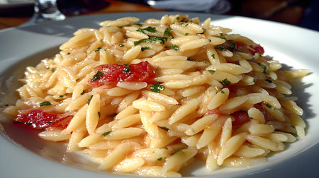 Orzo pasta dish featuring sun-dried tomatoes and fresh herbs, beautifully plated on a white dish, highlighting the vibrant colors and inviting textures of the meal