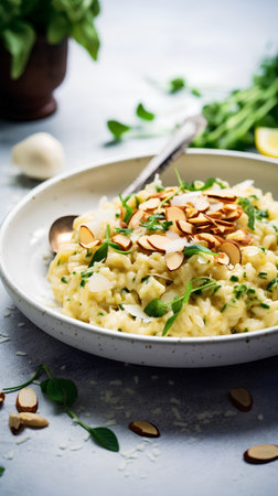 Risotto with arugula, cheese and nuts. Selective focus.