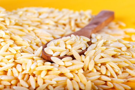 Healthy orzo pasta spilling from wooden scoop