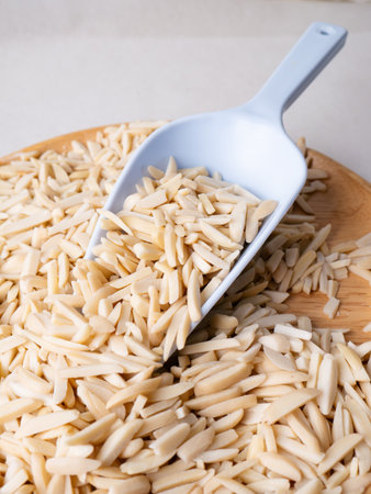 White Almond Stick set on wooden board with versatile scoop and white background.