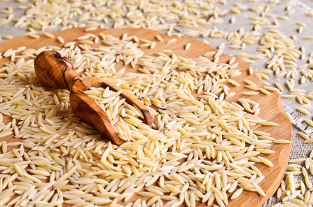 Pasta Orzo in the form of rice grains in a wooden scoop