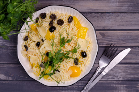 Small pasta with vegetables and pea sprouts in a plate on a wooden background. Top view. Selective focus.