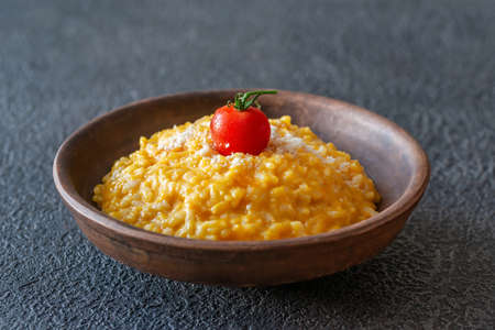 classic italian saffron risotto alla milanese served with parmesan cheese and corn salad plant