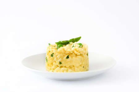 An elegant dish of risotto featuring vibrant colors and textures, arranged artfully on a plate with a clean white background, providing generous copy space for culinary descriptions. -