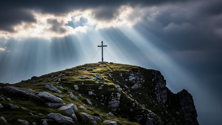 Landscape with cross on rocky mountain peak of Gimpel (Austria) on sunny day