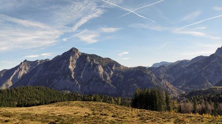 Mountain and alpine hill landscape mountains and rocks peaks panorama with green fields forest fir trees nature and blue sky in the Eastern Alps Salzburg Region Austria.
