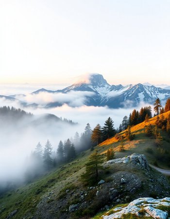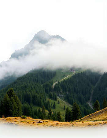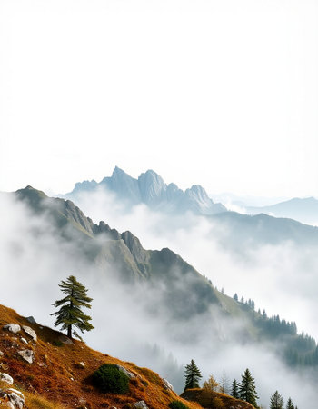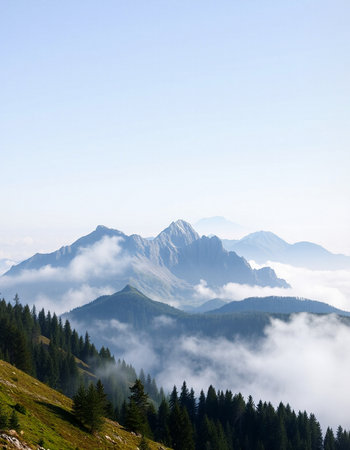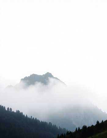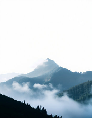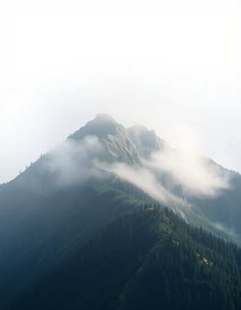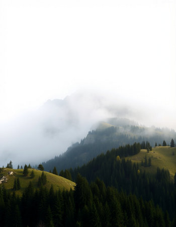 Discover a breathtaking mountain landscape shrouded in fog, with lush forests ascending into the clouds, creating a serene and tranquil atmosphere perfect for nature lovers.