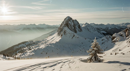 Beautiful winter landscape in the mountains. Sunrise. Panoramic view.