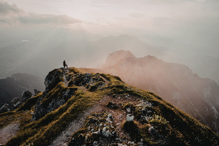 A lone figure stands on a rocky mountain peak, overlooking a sea of clouds and distant mountain ranges during sunset.