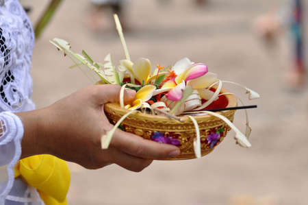 Traditional symbols and offerings to the gods during Balinese blessing ceremony on ocean with newlyweds and clergyman. Priest conduct ceremony on the shore. Soft focus.