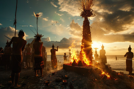 During a traditional ritual event, a woman is praying with a happy smile in front of the warm fire in a temple, following the ageold recipe of her ancestors