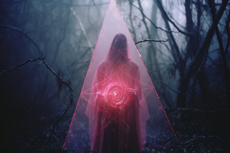 Mysterious silhouette of a woman standing in the middle of a dark forest