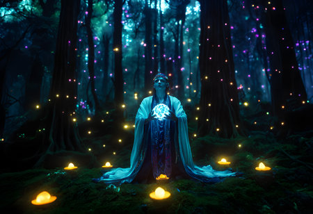 In a mystical forest setting, glowing orbs of purple, blue, and yellow illuminate the scene, suggesting a realm of enchantment. At the center, a figure resembling a shaman sits with outstretched hands, cradling a radiant orb that casts a luminous glow. The shaman is garbed in richly patterned robes that drape around them, merging with the forests cool hues. Their composed face is accentuated by a headband, and their serene demeanor reflects a profound connection with the forests magical essence. The scene radiates tranquility and otherworldly allure, with candle-like lights nearby, reinforcing the spiritual ambiance.
