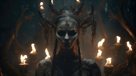 a demon, adorned in a traditional costume, stands amidst the dark woods, holding candles. the photograph showcases intricate details of the dark beige and gray attire, reminiscent of germanic art. the skull motifs add an eerie touch to the portrait, captured with precision using the tokina at-x 11-16mm f/2.8 pro dx ii lens. ai generated