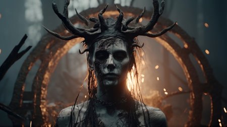 a rabbit man shaman, adorned with big horns and numerous talismans and pendants, holds a ceremonial staff as he stands amidst a dark and eerie forest. the photorealistic depiction showcases intricate details, capturing the creepy lighting and setting reminiscent of a scene from a scary movie. ai generated