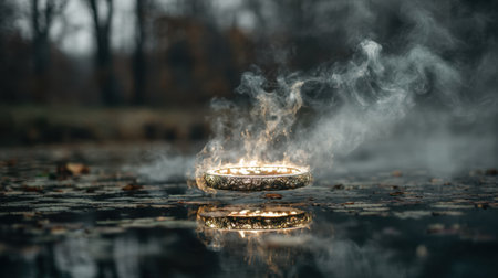 A mesmerizing golden ring floats above still water, enveloped in mystical smoke. This serene autumn scene captures tranquility and mystery.