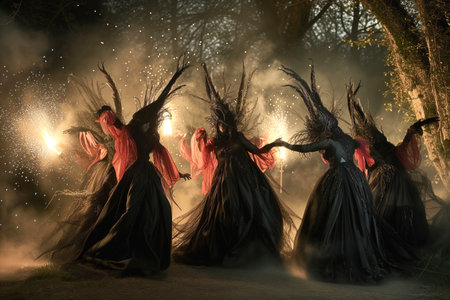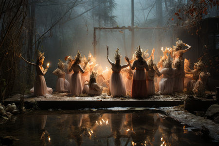 Women dressed as magical creatures perform ritual dance with fire in middle of forest at night of Walpurgis. Celebrating ancient holiday. Spending evening with friends in costumes
