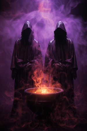 Two faceless hooded figures casting a spell into a cauldron, purple atmosphere, fire, magic, dark, cemetery, lightning.